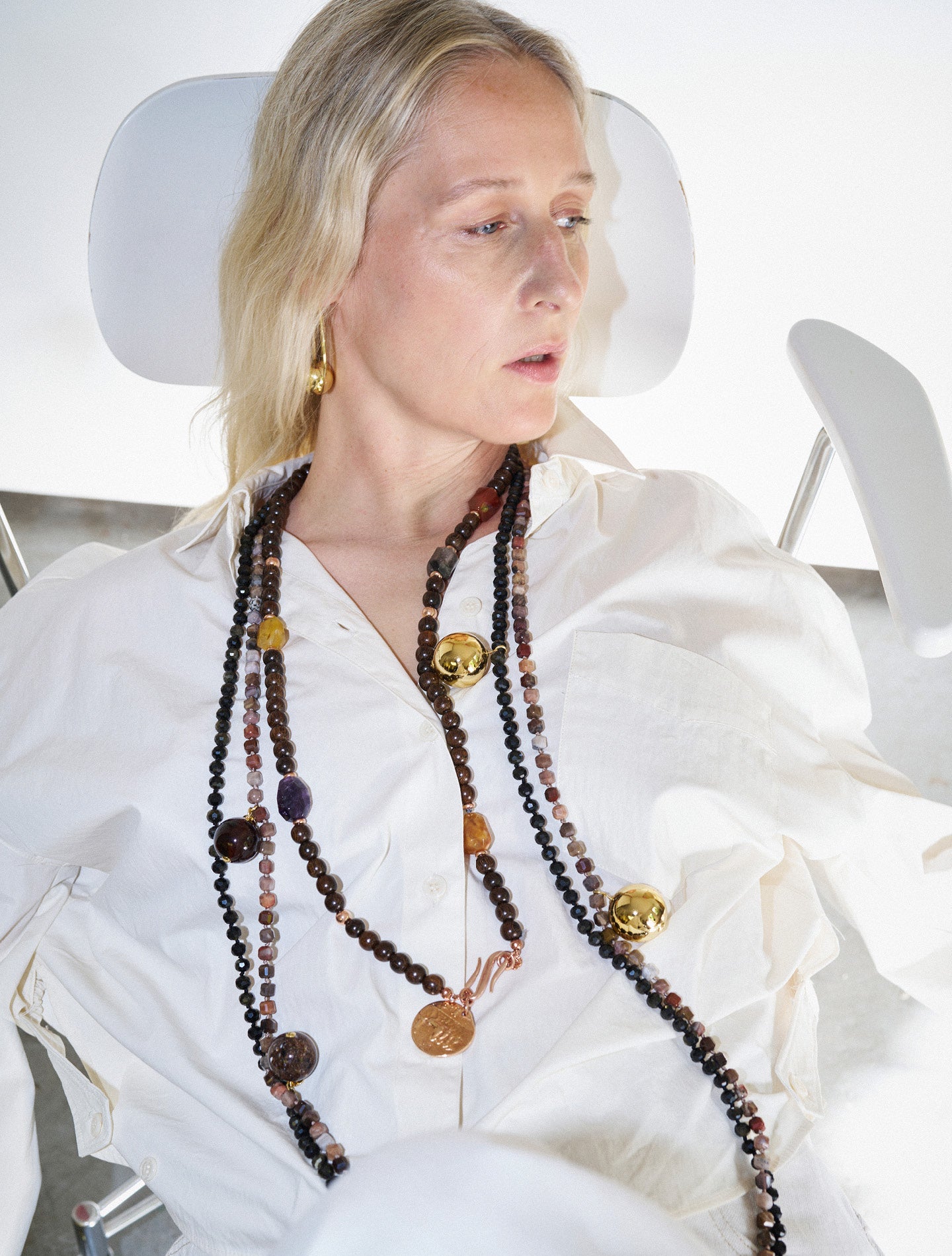 Ketten – halsnah oder in Maxilänge – komplettieren den Look und versehen ihn mit wohl dosiertem edgy Twist. Sinnlich, individuell und informell. Aufregende Silhouetten, erlesene Materialien und ausbalancierte Farbspiele verschmelzen zu ausdrucksstarken Schmuckstücken für die Frau.