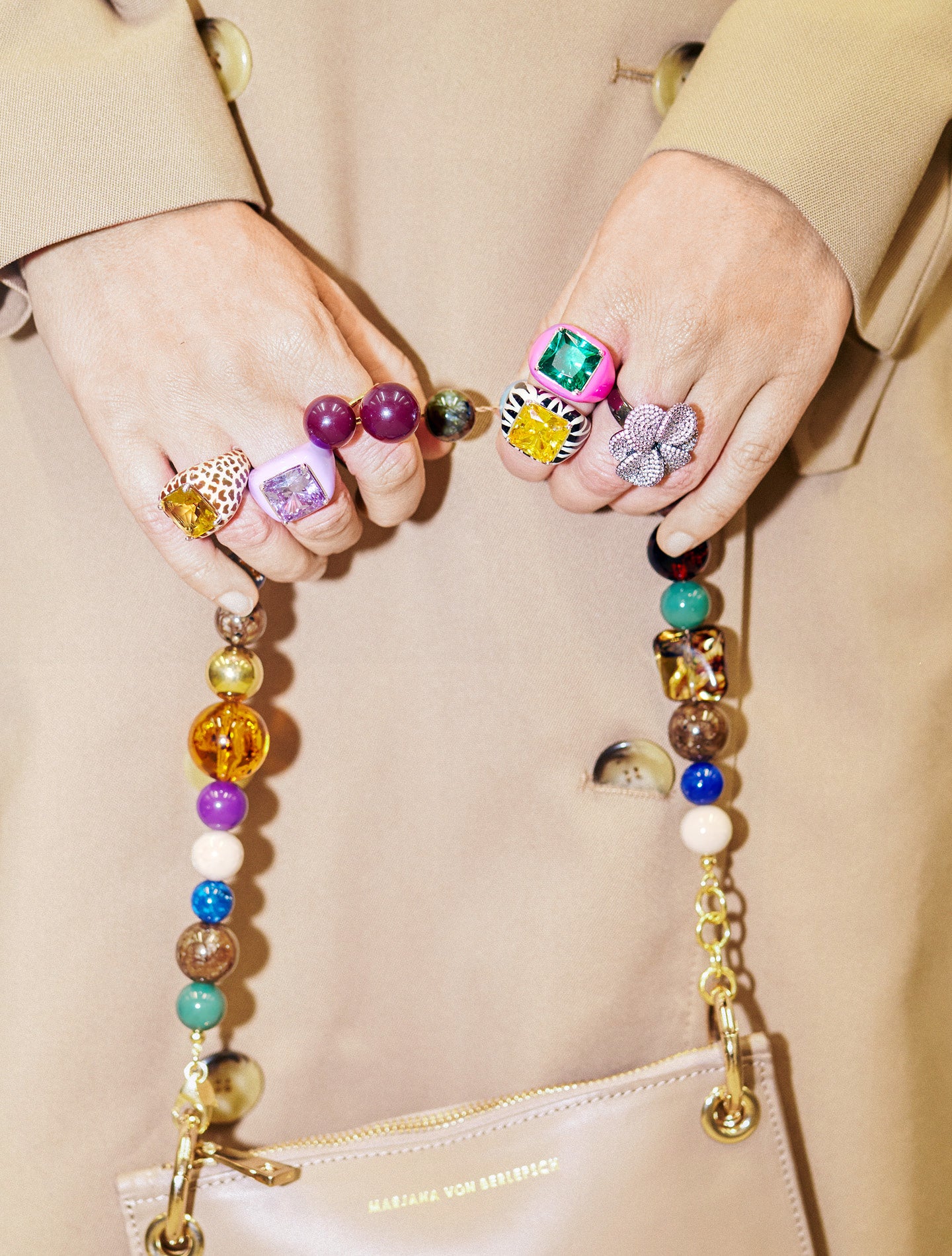 Edelsteine treffen auf Metall, Horn, Koralle, Leder. Spannende Materialmixe geben den Statement-Pieces ihre ungezwungene Präsenz. Boho meets Contemporary. Mal laut, mal leise. Immer lässig und luxuriös.